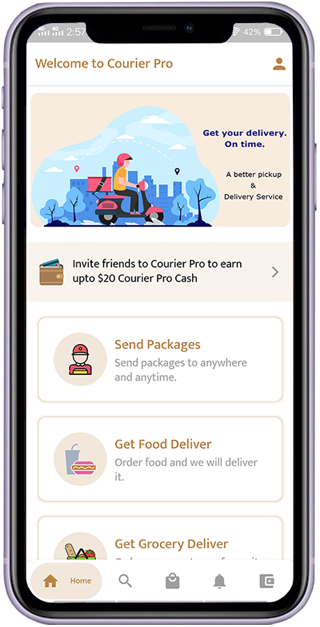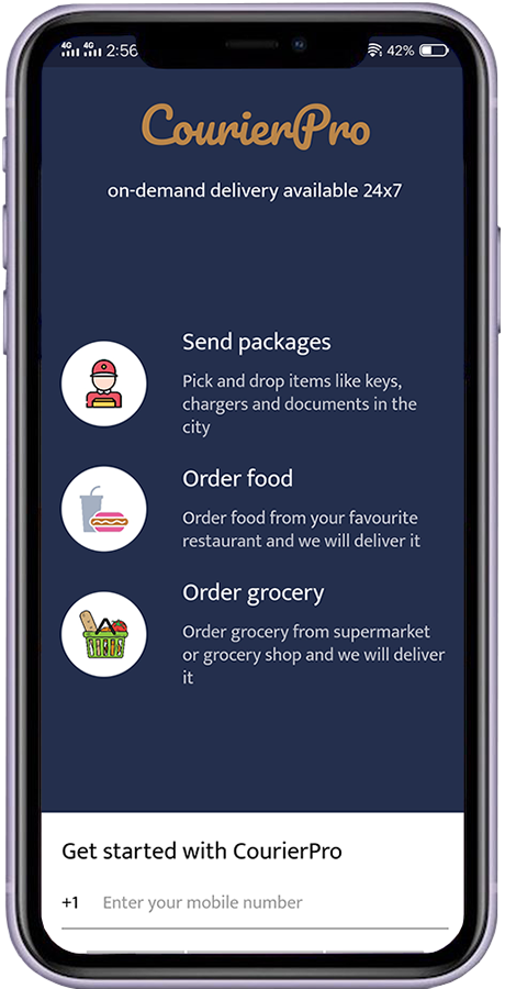 CourierPro is a Courier delivery App. User can send packages from one place to another place, Order grocery at nearby grocery shop and Order food from favourite restaurants. CourierPro developed using Flutter. That means that UI is compatible for both Android and iOS.